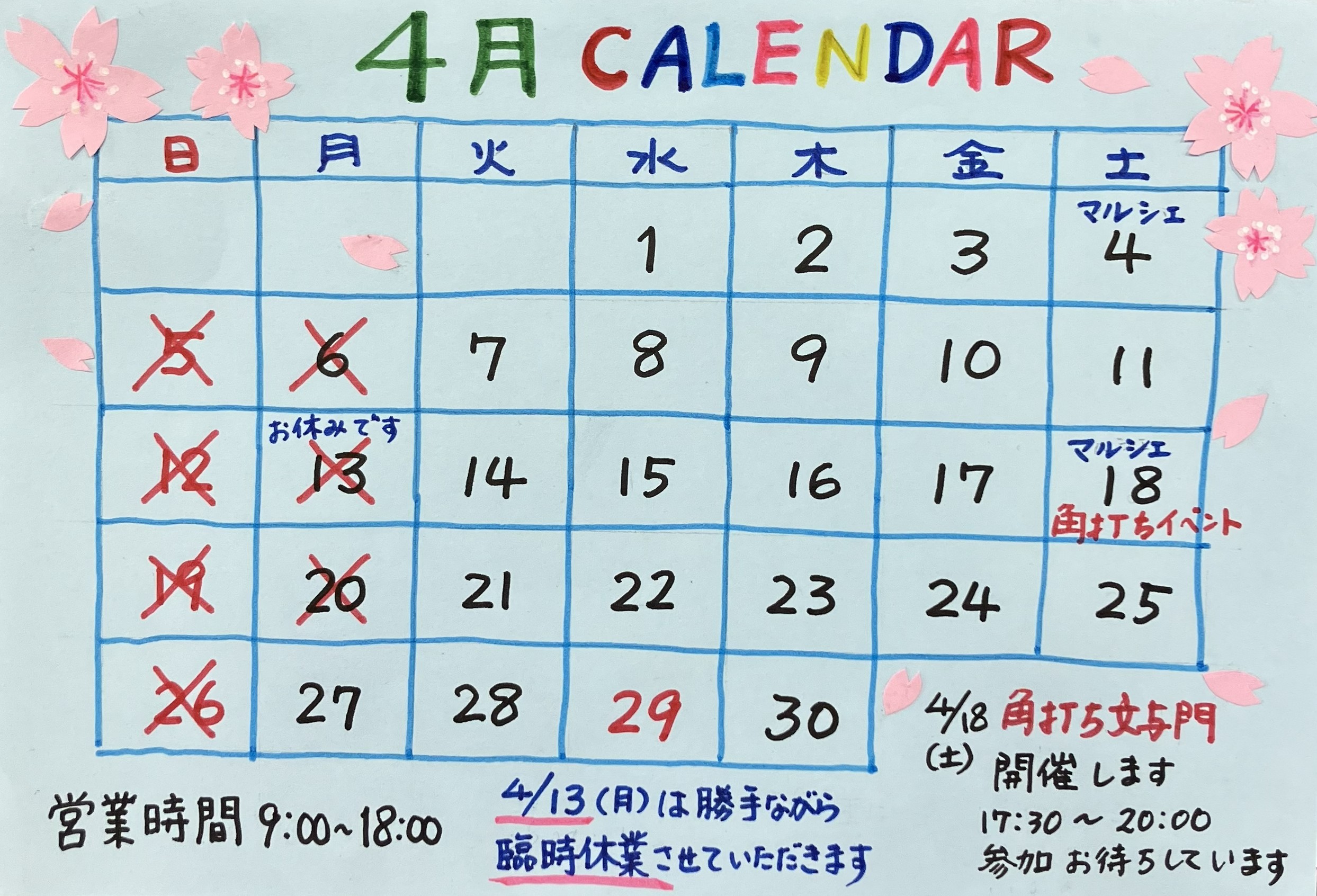 4月のお休みカレンダーです。